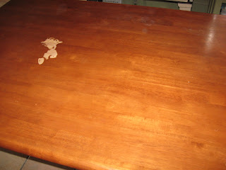I wrote a post in Jan. about getting a new table for xmas.I absolutely love my table.Well,in our house it is hard keeping things looking new for long!!!! The table got some scratches ,which is ok but then disaster happened.My husband took off a plug in from the outlet and left it on the table. The scented oil leaked and ate away part of the finish.I was so upset because it was a present and I was having a bad day.I basically whined about it for a while and then the kids gave different ideas to fix it.My boys said I should paint it.I was thinking I would refinish it, but I ended up painting it black and adding 4 layers of shellac to protect it.Here are some pictures of the ordeal and the finished table.