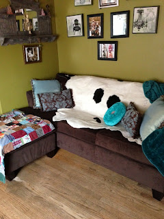 I finally found a cowhide rug that was a really great price!!!! I was walking the other week in our downtown and saw the cowhide rug folded up in an antique store window.The day I saw it the store was closed so I didn't know how much it was going for or how big it was. I kept talking about it but never went to see what the hours were at the store and finally I was coloring a friends hair and asked about the owner of the store.I knew he knew the owner and he called him up and asked about the cowhide.So we agreed on a price and now it is mine!!!!!! I got it this Sat. I am beyond excited since I have been looking for one for soooo long. I am playing around with where it will end up.I would love it on the floor in the living room but I have a small dog that I am afraid would ruin it.For now I have it draped over our new modern sofa.Our house has an artistic ecletic look so I think it would work.Here are photos of the different looks. The photos with the sofa covered with throws and pillows is how I keep the sofa covered daily because of the dogs!!!!